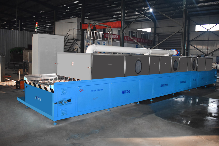 該設備有上下料網帶、超聲波清洗工位、噴淋漂洗工位、高壓風切、熱風烘干工位、溫控水加熱系統、風機、溫控空氣加熱系統、移動式風刀、PLC+觸摸屏控制系統、管路系統及智能電器控制系統等組成。自動進排液和自動加溫系統完全實現了無人干預,自動運行,很大程度上降低了工人的勞動強度。先進的霧氣處理系統可以將清洗時產生的霧氣冷凝回流,空氣經過濾和活性炭吸附后排出。