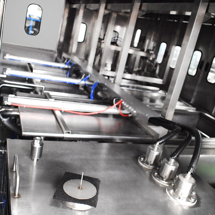 該設備有自動上下料及轉角系統、超聲波清洗系統,自動拋動、自動溢流和油污分離裝置,噴淋系統、自動高壓切水系統、自動烘干系統。機械手自動輸送系統采用高精度直線導軌配合高精度位置檢測傳感器,機械手可以準確的實現工件的抓取和放置。自動進排液和自動加溫系統完全實現了無人干預,自動運行,很大程度上降低了工人的勞動強度。先進的霧氣處理系統可以將清洗時產生的霧氣冷凝回流,空氣經過濾和活性炭吸附后排出。