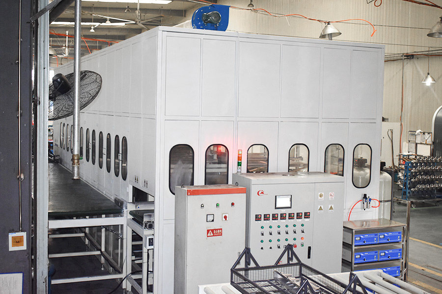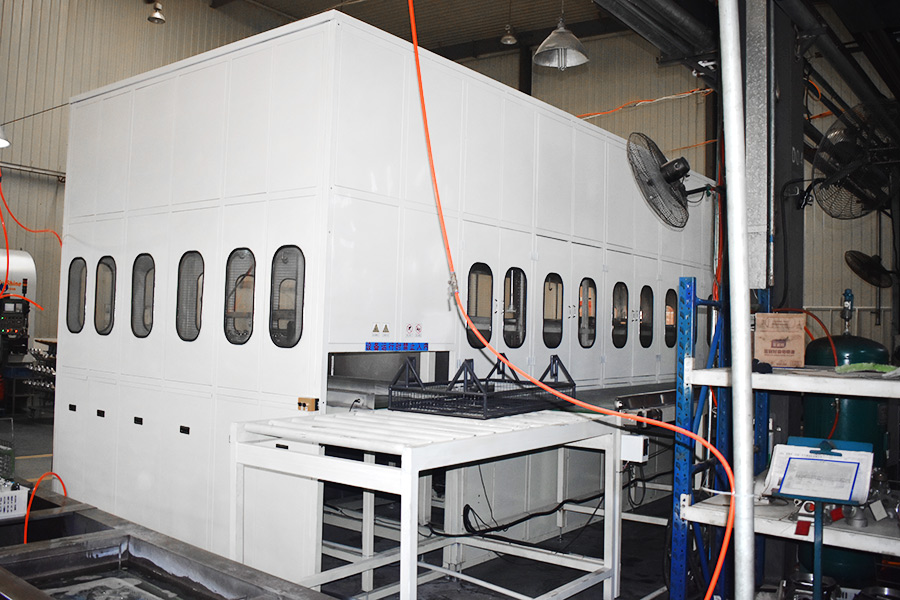 該設(shè)備有自動(dòng)上下料及轉(zhuǎn)角系統(tǒng)、超聲波清洗系統(tǒng),自動(dòng)拋動(dòng)、自動(dòng)溢流和油污分離裝置,噴淋系統(tǒng)、自動(dòng)高壓切水系統(tǒng)、自動(dòng)烘干系統(tǒng)。機(jī)械手自動(dòng)輸送系統(tǒng)采用高精度直線導(dǎo)軌配合高精度位置檢測(cè)傳感器,機(jī)械手可以準(zhǔn)確的實(shí)現(xiàn)工件的抓取和放置。自動(dòng)進(jìn)排液和自動(dòng)加溫系統(tǒng)完全實(shí)現(xiàn)了無(wú)人干預(yù),自動(dòng)運(yùn)行,很大程度上降低了工人的勞動(dòng)強(qiáng)度。先進(jìn)的霧氣處理系統(tǒng)可以將清洗時(shí)產(chǎn)生的霧氣冷凝回流,空氣經(jīng)過(guò)濾和活性炭吸附后排出。