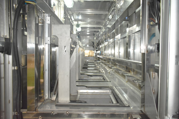 該設備有上料工位、 超聲波清洗工位× 4、 酒精漂洗工位、 風刀切液工位、下料工位、 廢液儲存槽× 2、溶液預加熱槽× 2、 桁架機械手、清洗工裝、 拋動系統、 隔爆溫控水浴加熱系統、 PLC+觸摸屏控制系統、 管路系統及智能電器控制系統設備等組成。該設備清洗效果好、提高了工件的清潔度。該機結構設計及工藝安排合理、自動化程度高、清洗精度高,有效解決了此類工件的清洗難題。