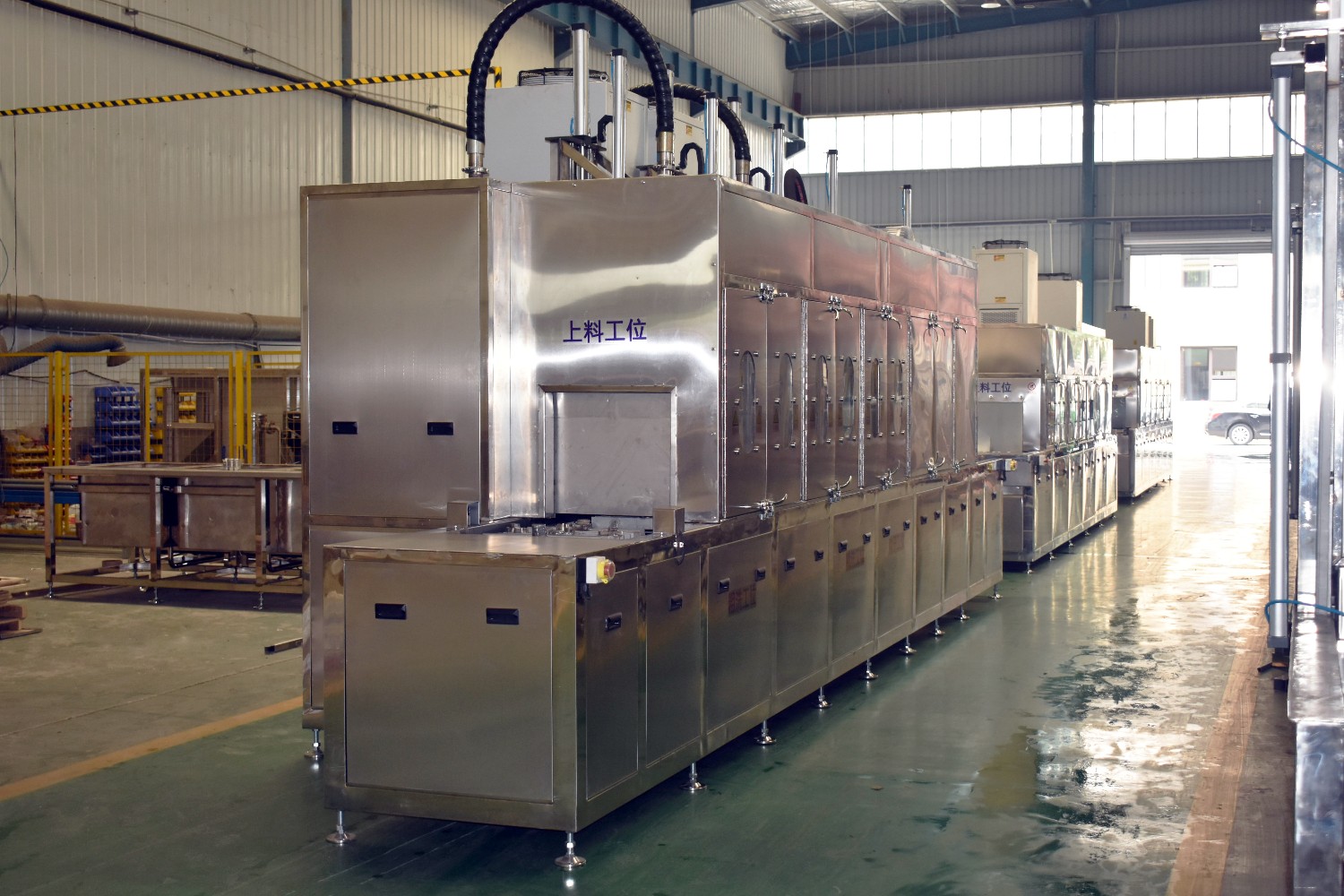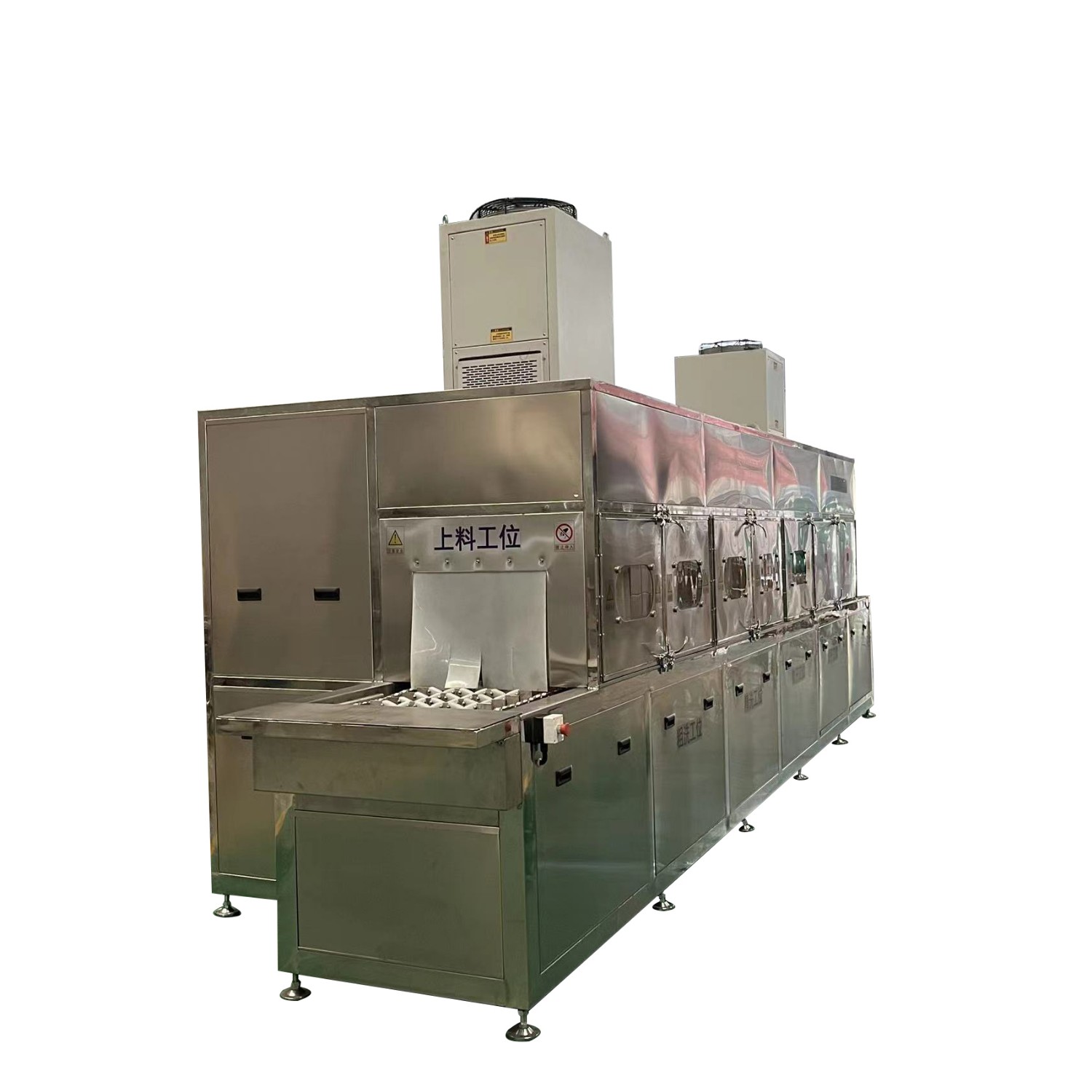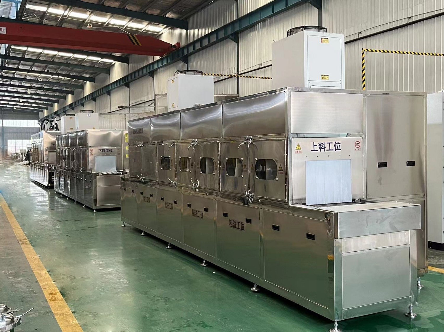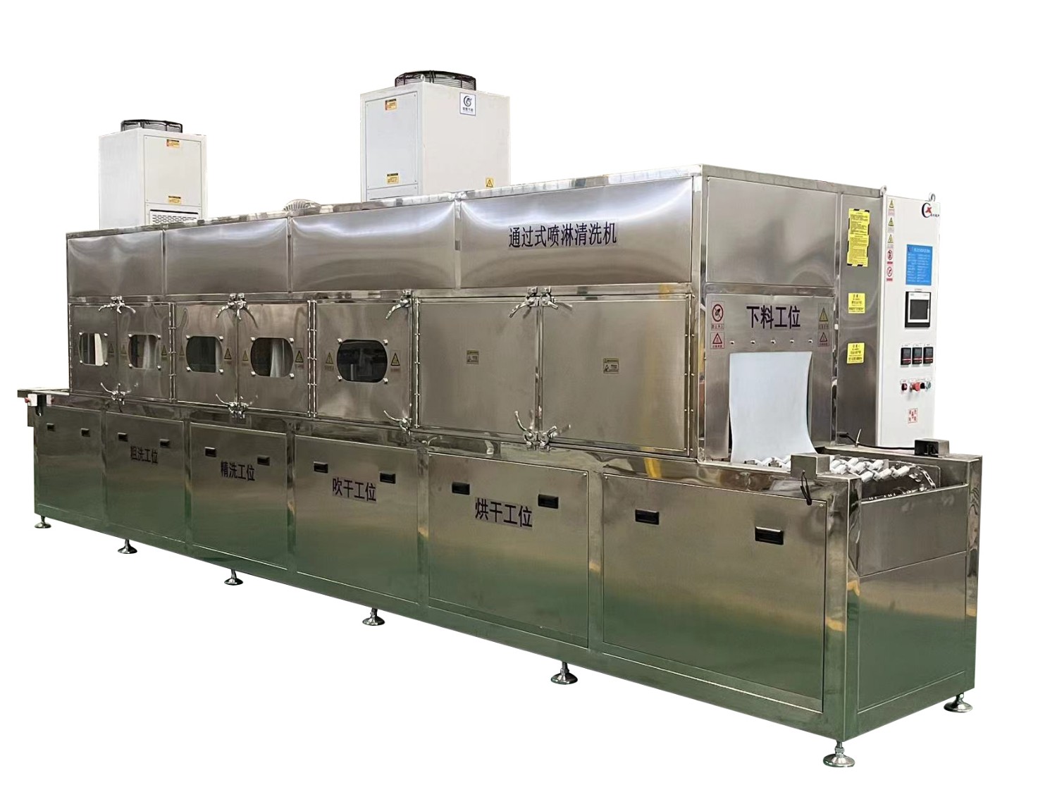 該設備有上下料網(wǎng)帶、噴淋清洗工位、噴淋漂洗工位、高壓風切、熱風烘干工位、溫控水加熱系統(tǒng)、風機、溫控空氣加熱系統(tǒng)、PLC+觸摸屏控制系統(tǒng)、管路系統(tǒng)及智能電器控制系統(tǒng)等組成。自動進排液和自動加溫系統(tǒng)完全實現(xiàn)了無人干預,自動運行,很大程度上降低了工人的勞動強度。先進的霧氣處理系統(tǒng)可以將清洗時產(chǎn)生的霧氣冷凝回流,空氣經(jīng)過濾和活性炭吸附后排出。