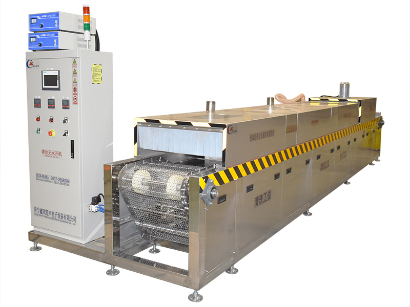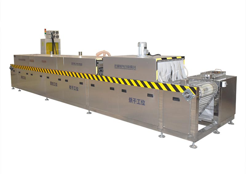 該設備有上下料網帶、超聲波清洗工位、超聲波漂洗工位、高壓風切、熱風烘干工位、溫控水加熱系統、風機、溫控空氣加熱系統、移動式風刀、PLC+觸摸屏控制系統、管路系統及智能電器控制系統等組成。自動進排液和自動加溫系統完全實現了無人干預,自動運行,很大程度上降低了工人的勞動強度。先進的霧氣處理系統可以將清洗時產生的霧氣冷凝回流,空氣經過濾和活性炭吸附后排出。